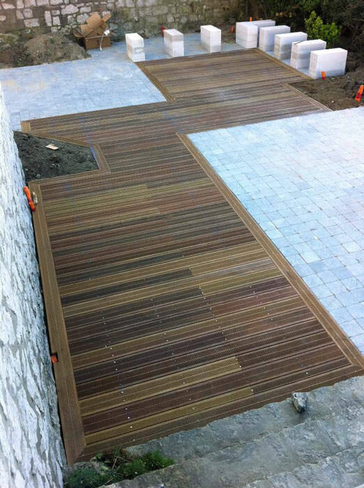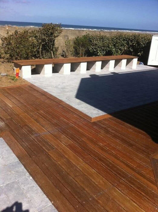 - Sur sol stable: sur ce type de sol (comme une dalle de béton ou des dalle), nous fixons des lambourdes ancré dans le sol sur lesquelles nous poserons le platelage de bois isolé par une cale plastique.